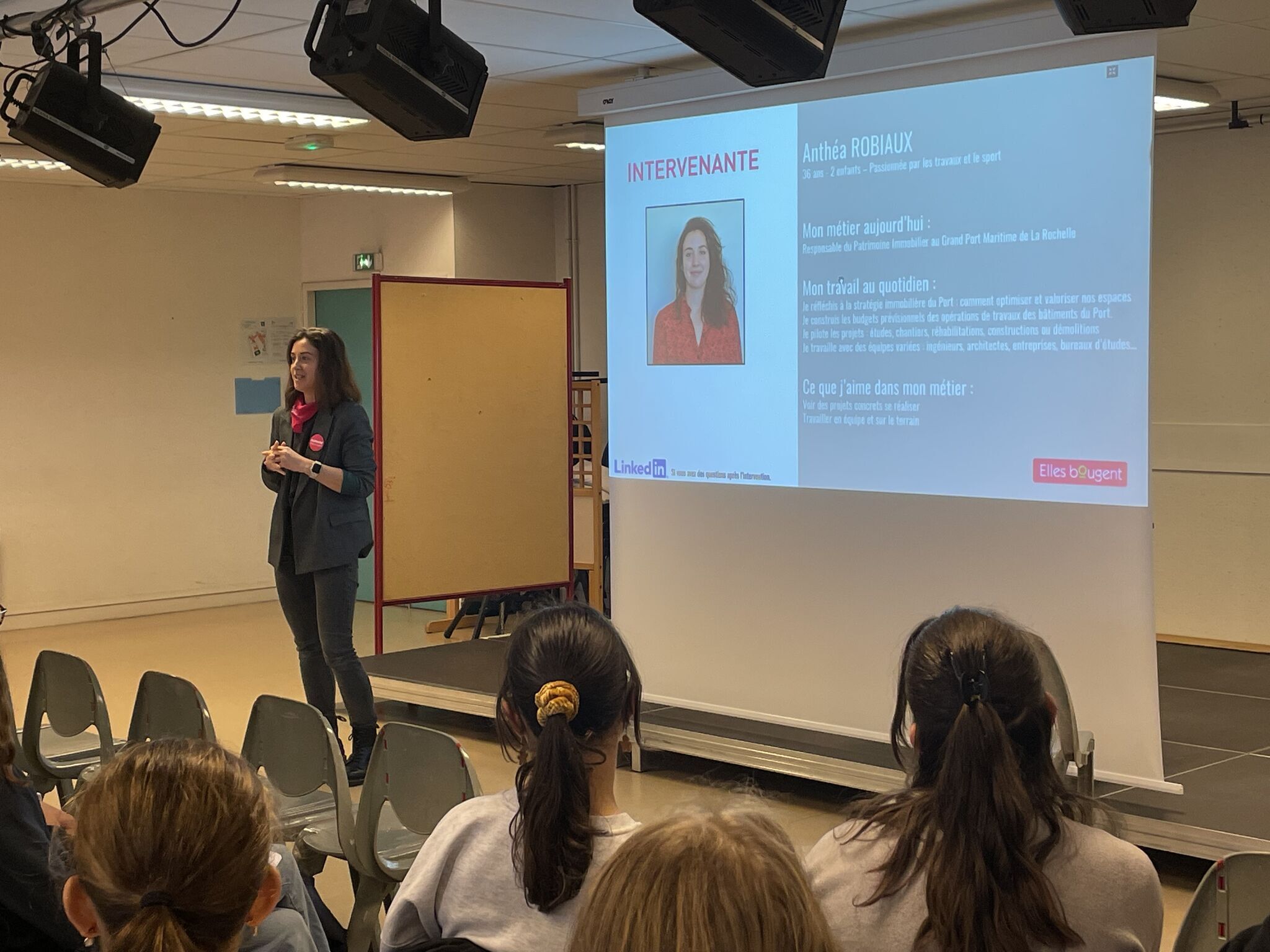 Port Atlantique La Rochelle s’engage pour la mixité dans les métiers techniques. Dans ce cadre, Anthéa Robiaux, Responsable du patrimoine immobilier au Port, est intervenue au lycée Vieljeux auprès de 77 lycéennes, lors d’une rencontre organisée par l’association Elles bougent.